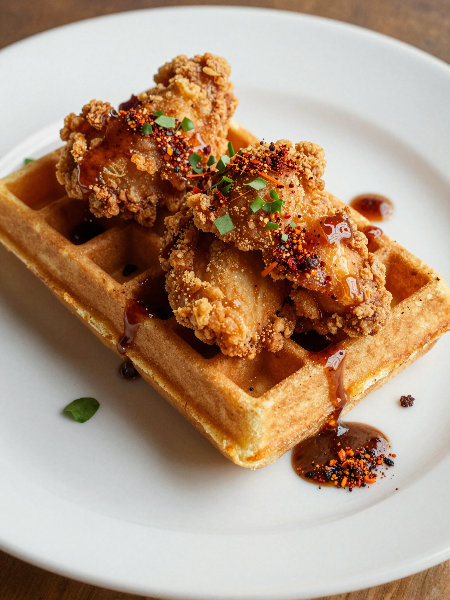 Buttermilk fried chicken on a savory chive waffle, finished with our signature spicy maple glaze.