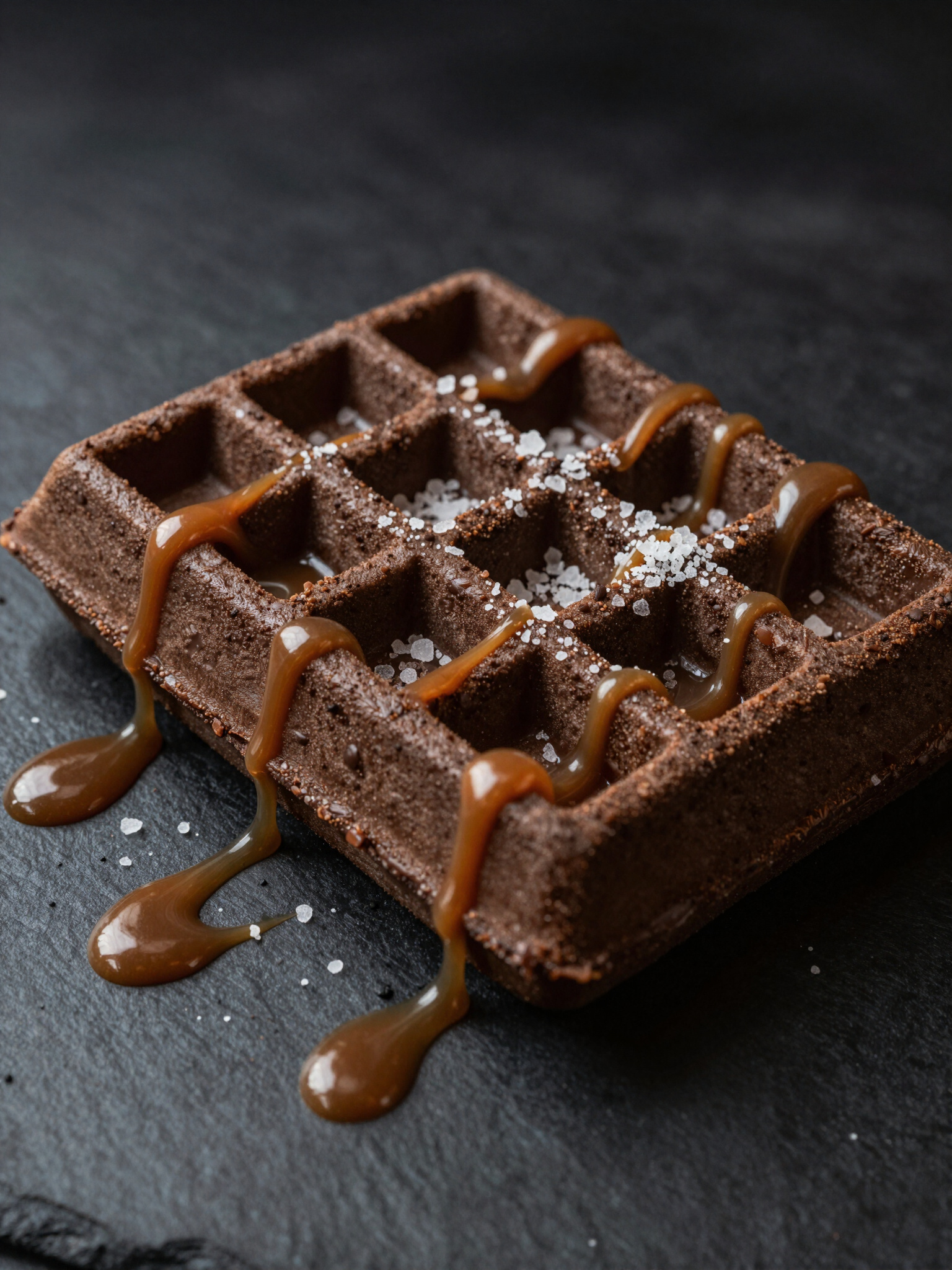 Dark cocoa waffle layered with sea salt caramel and crushed toasted pecans for a rich finish.